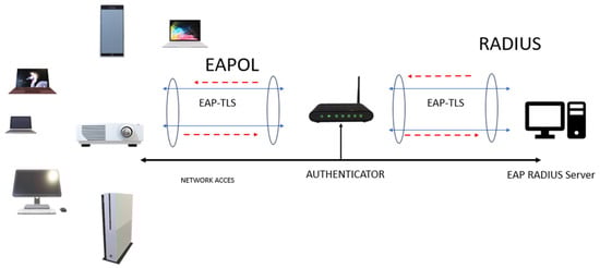 Extensible Authentication Protocol-Transport Layer Security (EAP-TLS) is a cryptographic protocol essential for ensuring secure communication over a network. It is widely used to protect data between devices (Figure 3). EAP-TLS operates at higher levels of the OSI model, specifically between the application layer and the transport layer.