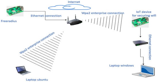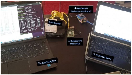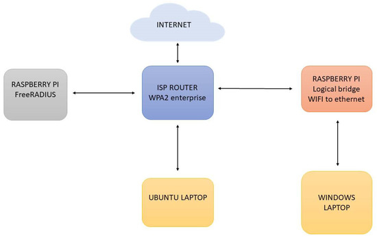 To create the testing framework, we created the setup, consisting of two Raspberry Pi boards (one for hosting FreeRadius and the other as a device for establishing a secure connection), a router received from the Internet Service Provider, and two laptops (one with Ubuntu operating system that connected to the network via the 802.1X protocol and the other with Windows operating system that was set up as IoT). Figure 6 illustrates the fundamental scheme regarding the operation of the proposed security system.