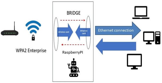 Our newly developed approach for secure IoT connections utilizes the 802.1X protocol and the Raspberry Pi development platform, ensuring connectivity through these protocols (as shown in Figure 5). Through it, the connection to the Wi-Fi network of devices that do not have the capability to use the 802.1X protocol is achieved.