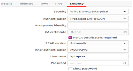 Authenticating the Ubuntu laptop, using the 802.1X protocol, is performed by entering credentials assigned to each user, as shown in Figure 7, as opposed to sharing a password among multiple users as is the case with the WPA2 Personal protocol [18].