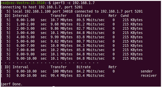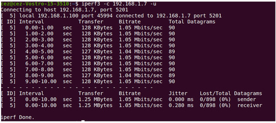 In UDP, the bit rate was constant at 1.05 Mbit/s throughout the test, indicating a stable connection; also, there were no datagram losses at either the sender and receiver ends, suggesting reliable transmission. Jitter was minimal (0.000 ms at the sender and 0.280 ms at the receiver), indicating a consistent and predictable latency. With Iperf3, we determined the properties of the connection achieved by implementing several authentication protocols using both TCP and UDP. It can be seen from Figure 9 that Iperf3 was used to determine the connection between the Ubuntu laptop and the Windows laptop, which was used as an IoT device, solely for the purpose of identifying the properties of the connection.