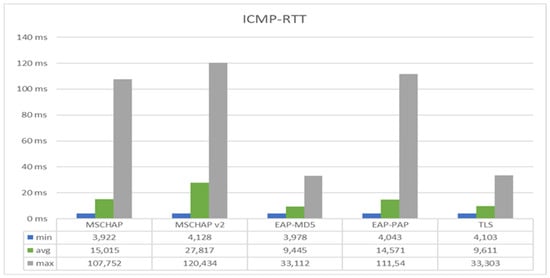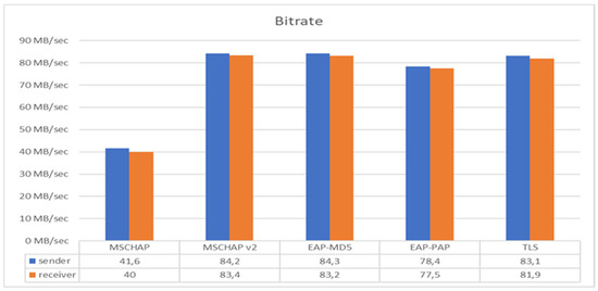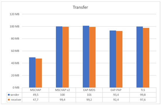 As can be seen in Figure 15, the best results were obtained through the EAP-MD5 protocol, and the lowest result was obtained through the MSCHAP protocol. Regarding the results obtained through the MSCHAPv2, EAP-PAP and TLS protocols, it can be observed that they also have good results in terms of transfer. Regarding the results obtained through the MSCHAPv2, EAP-PAP, and TLS protocols, it can be observed that they also deliver good results in terms of transfer speed. While MSCHAPv2 offers a more secure alternative to MSCHAP, it still presents some performance trade-offs compared to EAP-MD5. EAP-PAP, despite being a relatively simple protocol, is susceptible to attacks and lacks strong encryption, which may hinder its suitability in environments where robust security is required.