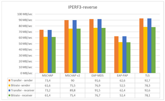 In Figure 16, using Iperf3 in reverse mode, it is observed that the protocol with the worst results is EAP-PAP and the protocol that offers the highest security, namely TLS, has very good results compared to the other protocols. It should be added that by this method, Iperf3 also measures the flux transmitted from the receiver to the transmitter. It should be noted that, in this mode, Iperf3 also measures the data flow transmitted from the receiver to the transmitter. This aspect is particularly important when evaluating the bidirectional impact of authentication mechanisms on network performance. Since EAP-TLS relies on certificate-based authentication rather than password exchange, it minimizes retransmissions and ensures a smoother data flow. EAP-TLS, as expected, provides the highest level of security, offering excellent encryption and authentication, though it may involve higher computational overhead compared to simpler protocols. Despite this, it still performs relatively well in terms of data transfer, particularly when considering its significant security advantages. This balance of security and performance makes EAP-TLS a strong candidate for environments requiring both high performance and robust protection.