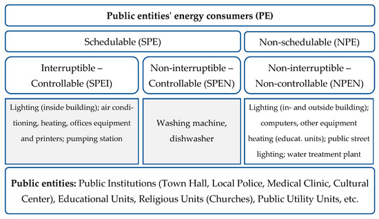 To enable targeted energy optimization, the electrical appliances used by public institutions are classified based on their controllability and operational flexibility. This classification leads to two major categories: schedulable (SPE) and non-schedulable (NPE) loads. Further subdivisions include interruptible and non-interruptible loads, as depicted in Figure 1.