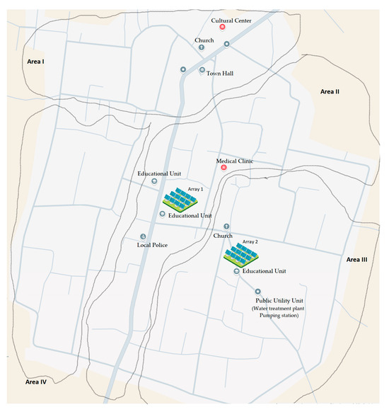 Planning energy consumption in the locality. In Figure 3, a plan of the locality is presented, highlighting the consumption points of public entities. Also, a division into four consumption areas is observed, each of these areas being connected to a voltage phase (areas I and IV to phase 1, area II to phase 2, and area III to phase 3). This plan includes the location of each institution, thus allowing for the identification of areas with high consumption and the implementation of systems for generating energy from photovoltaic sources and measures to enhance the efficiency of the produced energy utilization.
