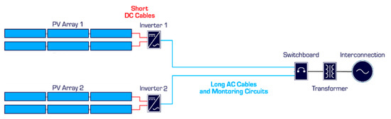 A simplified schematic of the connection to the local distribution grid is shown in Figure 4, which includes a voltage boost converter to increase DC output to 500 V and an MPPT (Maximum Power Point Tracking) system to maintain optimal performance.