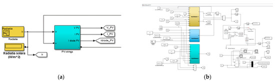 Figure 5 illustrates the overall model structure, while Figure 6 provides a detailed view of the PV module block. The model is calibrated for a nominal solar radiation of 1000 W/m2 to assess maximum generation potential. The number of PV panels was selected to achieve the target output of 83.6 kW.