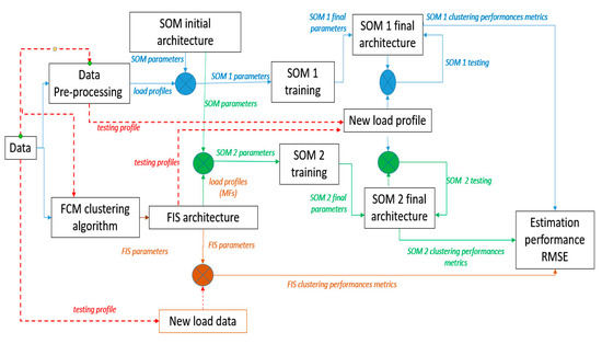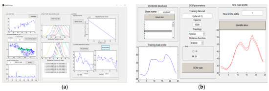The monitored data related to load values, stored in .dat or .xls formats and correlated with the day of the week, are utilized by the Fuzzy C-Means (FCM) algorithm to extract membership functions (MFs) corresponding to a predefined number of clusters, within a maximum number of iterations. The second phase of modelling and simulation involves the automatic extraction of fuzzy rules based on the derived MFs, followed by the construction of a fuzzy rule base. These rules are expressed in a verbose format using linguistic terms. Subsequently, the root mean square error (RMSE) is calculated during the training and testing phases, in relation to the objective function. The FCM process follows an iterative loop consisting of problem initialization, Euclidean distance computation, and cluster updating steps (Figure 10a).