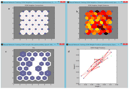 The relative number of input vectors associated with each neuron is depicted by the size of the colour patches in Figure 12c, which visualizes the SOM layer with each neuron sized proportionally to the number of classified vectors. Figure 12d displays the input data overlaid on the SOM weight vectors. In this figure, green dots represent the input vectors, while blue-grey dots represent the SOM weight vectors. Neighbouring neurons are again connected with red lines, illustrating how the SOM classifies and structures the input space.