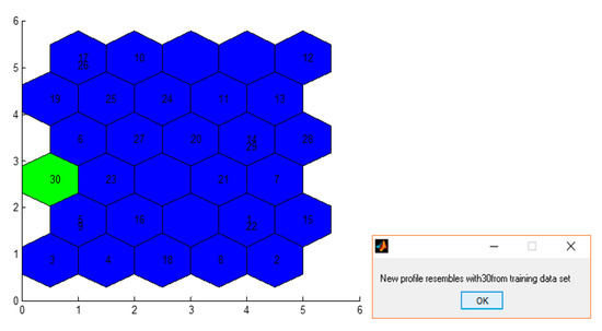 Since SOM training does not require a specified target output, unlike many other types of neural networks, its performance is evaluated using the winning node—also known as the Best Matching Unit (BMU). This BMU is identified and displayed in green in Figure 13.
