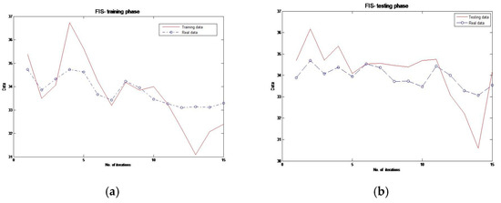 FIS-FCM error evolution with iterations in the (a) training phase and (b) testing phase.