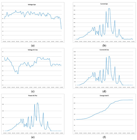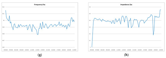 Simulation results on 12 May 2024; (a) Voltage Upv; (b) Current Ipv; (c) Voltage Uac; (d) Current Iac; (e) Power Pac; (f) Energy total; (g) Frequency Fac; (h) Impedance Zac.