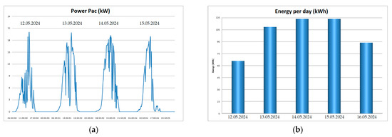 Power and energy data 12–15 May 2024: (a) Power Pac; (b) Energy per day.