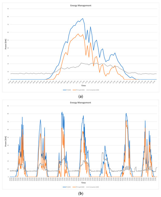 In this research, the considered smart grid was represented by public entities (territorial administrative unit) with an installed power system based on photovoltaic panels of 83.6 kWp with an estimated production per year of 97.6 MWh/year (Figure 4), smart loads, and with the possibility of operating, due to the existing connections only on grid.