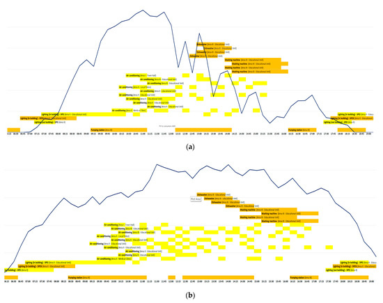 Figure 18a,b show the implementation of the load shifting algorithm on two separate days. Energy-intensive operations of SPE and SPEN appliances were automatically aligned with periods of maximum PV generation, leading to minimized grid dependency and improved local energy self-consumption.