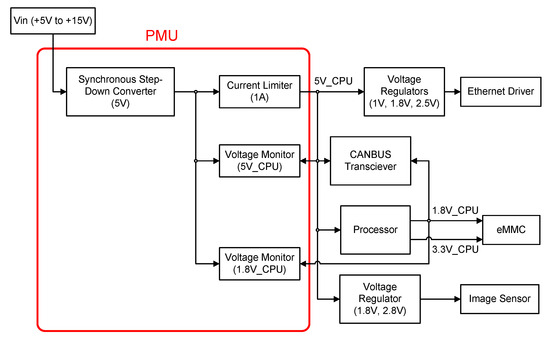 The Power Management block includes the Power Management Unit (PMU), which is independent of the CPU as it only monitors the power drawn by the board and has no logical connection to anything else. The power management block architecture of the image sensor system is shown in Figure 4.