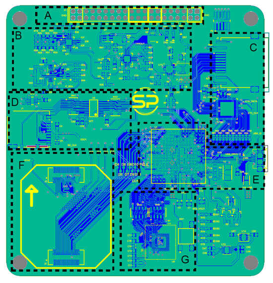 - E: The core of the PCB contains the microprocessor and a USB connector, which is utilized for system debugging purposes.