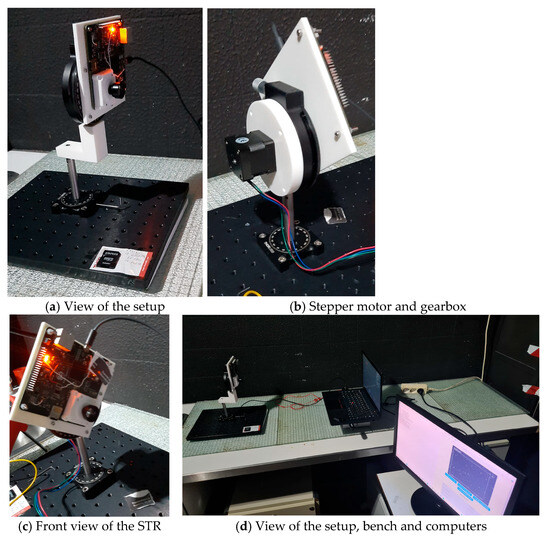Figure 15a shows the view of the setup composed of the optical bench, the optical post with micrometric regulations and the STR connected to a stepper motor and a gearbox; Figure 15b shows the back view of the STR connected to the stepper motor and the gearbox; Figure 15c shows the front view of the STR and Figure 15d shows the view of the setup composed of the optical bench, the optical post, the STR, the laptop to run the Tetra3 algorithm [16] and the screen.