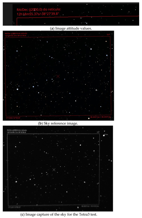 In Table 2, there is a slight discrepancy between the values provided by Stellarium and Tetra3. This occurs because Stellarium gives the exact coordinates of the center of the frame (marked by the red crosshair in Figure 16a,b), whereas the center of the image captured by the star tracker does not perfectly align with this point. Additionally, the star catalog used by Tetra3 may differ slightly from Stellarium’s database, which can introduce minor variations in the attitude estimation. Despite these differences, the results are consistent enough to confirm the correct functioning of the attitude detection system.