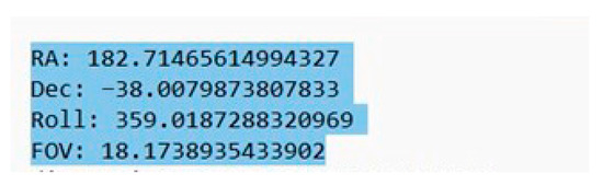 Figure 16 and Figure 17 and Table 2 show that the RA value is 182.71°, the Dec value is -38.00°, the Roll value is 359.01° and the FoV value is 18.17°. The test successfully demonstrates that the star tracker camera is fully functional, and the image processing pipeline between the sensor and processor operates correctly. The accurate determination of RA and Dec confirms that the Tetra3 algorithm is properly integrated and capable of reliable star identification, validating the overall performance of the attitude determination system. Additionally, the FoV observed in the results closely matches the expected value with the lens on the sensor, further confirming the system’s alignment with design specifications.