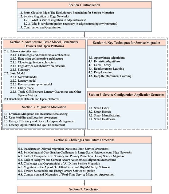 Although this survey does not follow the PRISMA guidelines for systematic reviews, we have curated a representative and focused set of recent studies. The selection was guided by three main principles: (i) technical relevance to real-time service migration in edge environments; (ii) publication quality, including peer-reviewed papers from high-impact venues; and (iii) empirical rigor, as demonstrated by the presence of evaluation, modeling, or implementation results. To facilitate a comprehensive understanding of this survey’s structural framework, Figure 1 schematically illustrates its overall organization. To ensure the consistency and relevance of our survey, we adopted the following criteria for including or excluding specific service migration strategies: