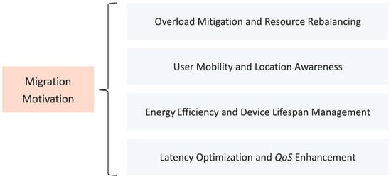 - Objectives: Service migration aims to address several optimization goals, including minimizing response latency, avoiding overloaded nodes, maintaining service availability under user mobility, reducing energy consumption, and enhancing overall QoS. In latency-critical or mission-critical applications such as autonomous driving or remote healthcare, timely migration is key to meeting service-level agreements (SLAs) [18,19].