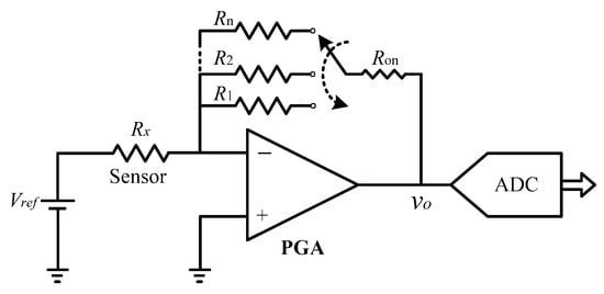 Circuit configuration for measuring a wide range of sensor resistances using a multiple-interval approach. The switchable resistor network (R1, R2, …, Rₙ) is connected through analog switches with on-resistance , as indicated by the dashed arrow. The PGA adjusts the output voltage , which is digitized by the ADC.