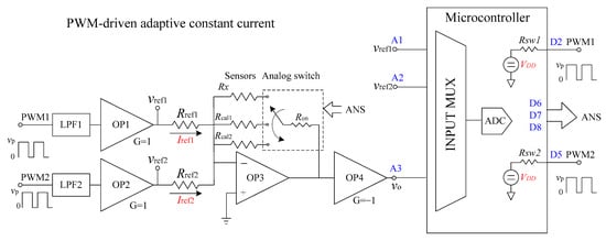 Proposed resistive sensor measurement system using a PWM-driven adaptive constant current source. The excitation currents (, ) are defined by . The analog switch network selects among sensor branches containing or along with the switch on-resistance . The differential signal is amplified and digitized by the microcontroller’s ADC via the input multiplexer.