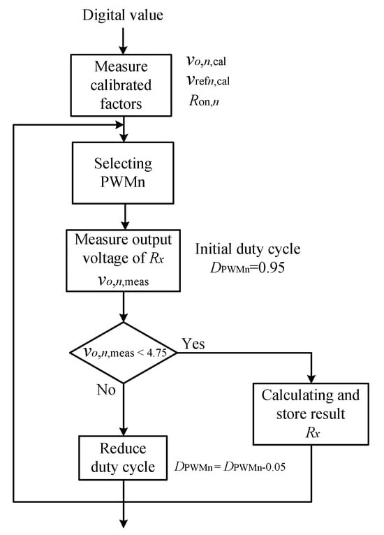 Figure 3 illustrates the flowchart of the measurement algorithm used to determine the unknown resistance using the proposed dual-PWM excitation system. The process begins by measuring the calibration parameters—, , and —using a known calibration resistor . Next, the system selects the appropriate PWM channel by temporarily setting PWM1 to a low duty cycle (e.g., 0.2). If the resulting output voltage exceeds 4.75 V, indicating that the resistance is too high for PWM1, the system switches to PWM2. The actual sensor measurement then proceeds by setting an initial PWM duty cycle (e.g., 0.95), measuring , and incrementally reducing the duty cycle to bring the output voltage within the desired range. The detailed steps are described in the following subsections.