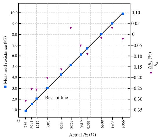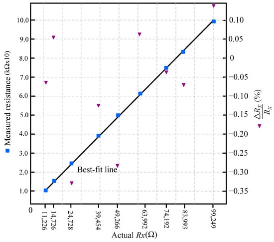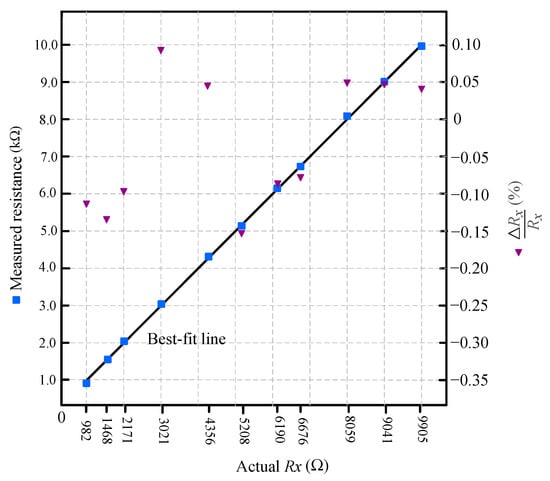 Measured resistance versus actual resistance in the 1−10 kΩ range using the calibration-based method (Equation (3)). Calibration was performed with Ω. Blue squares represent the measured data, and the black line indicates the best-fit line. Relative error (%) is shown using downward purple triangles on the secondary axis.