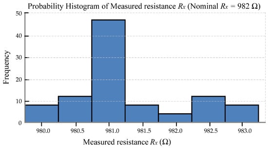Probability histogram of measured resistance for a nominal 982 Ω resistor, based on 100 consecutive readings (each averaged over 100 ADC samples). The tight distribution demonstrates high measurement repeatability and noise robustness, particularly when is close to the calibration resistor Ω.
