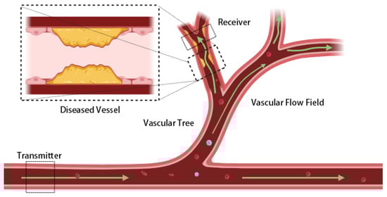 Molecular communication (MC), enabled by advances in nanotechnology and biocommunication, has emerged as a promising paradigm for information transfer in biomedical environments []. In MC, messenger molecules propagate via diffusion, convection, and reaction, offering intrinsic biocompatibility within complex fluidic systems such as blood [,]. When combined with implantable or wearable sensors, MC-based systems within the Internet of Bio-Nano Things (IoBNT) can enable continuous physiological monitoring and timely therapeutic intervention through mobile health platforms []. Importantly, IoBNT-based MC systems should be regarded not only as communication platforms but as complex, adaptive biotechnological artefacts operating across multiple biological and technological scales []. Their adaptive complexity—integrating heterogeneous vascular environments, molecular transport dynamics, and nanoscale sensing with mobile infrastructures—underpins the potential for continuous, personalized, and clinically meaningful vascular health assessment [].