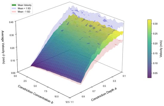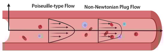 In MC modeling, blood flow characteristics significantly influence signal transport. Under ideal Newtonian fluid conditions, the velocity profile follows classical Poiseuille flow, with axial velocity in a cylindrical pipe forming a parabolic distribution peaking at the center []. However, real blood flow is governed not only by plasma viscosity but also by the distribution of suspended particles such as red blood cells and platelets, often manifesting a “plug flow effect.” This phenomenon involves marked cell aggregation near the lumen center, leading to a flattened velocity profile (see Figure 2). It becomes more pronounced with decreasing vessel radius and shear rate, violating the Newtonian fluid assumption [,,].