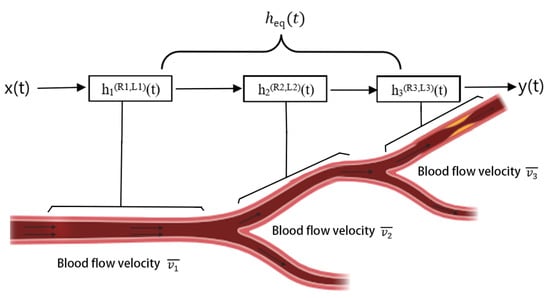 Vascular modeling framework based on MC. The branched vessel network is represented as a cascade of cylindrical sub-channels, each characterized by its own length, radius, and flow velocity. The time domain impulse response of each segment captures the effects of convection, diffusion, and vessel geometry. The overall system response, , is obtained by convolving the sub-channel responses, thereby linking local vascular dynamics to signal propagation across the entire network.