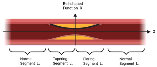 Accurate flow field modeling in stenosed vessels relies on appropriate stenosis geometry. Studies show that real arterial stenoses are often symmetric or near-symmetric and can be described by bell-shaped functions, which capture velocity, pressure, and shear stress variations effectively [,,]. The vessel is modeled as an inlet healthy segment, a bell-shaped contraction, a bell-shaped recovery, and a healthy outlet segment. The contraction and recovery are axially symmetric, each of length , while the healthy segments each span , giving a total stenosed length of (Figure 4).