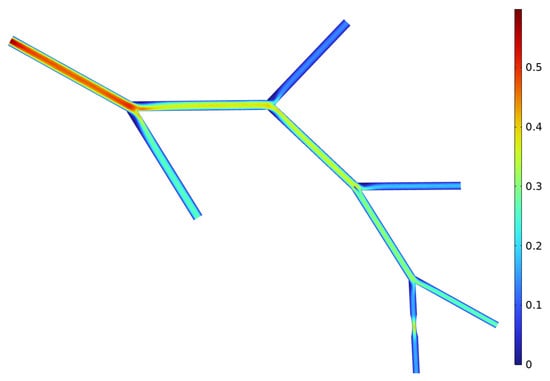 Velocity distribution in the simulated vascular model. The color map shows local blood flow velocity across the branched network, with higher velocities near constricted regions and lower velocities in wider branches. These results illustrate how stenosis alters the hemodynamic environment and provides the basis for subsequent analysis of molecular transport.