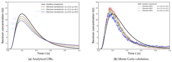These assumptions enable the derivation of closed-form channel impulse responses and facilitate systematic analysis of adsorption–desorption kinetics within cascaded vascular segments. At the same time, they delimit the scope of the model and may lead to deviations in scenarios involving asymmetric stenoses, pulsatile hemodynamics, elastic wall deformation, or heterogeneous hematocrit distributions. Addressing these factors constitutes an important avenue for future refinement and validation.