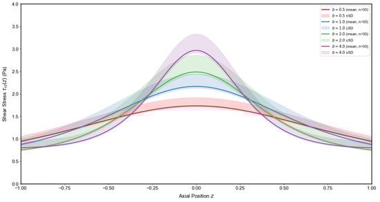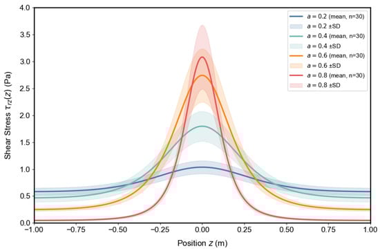 here, we define as the peak wall shear stress at the throat (). Thus, the throat shear stress peak increases linearly with stenosis ratio a. As stenosis worsens (), rises sharply, potentially inducing endothelial stress-related changes in molecular attachment, endothelial dysfunction, and physiological damage.
