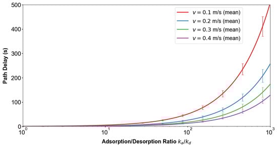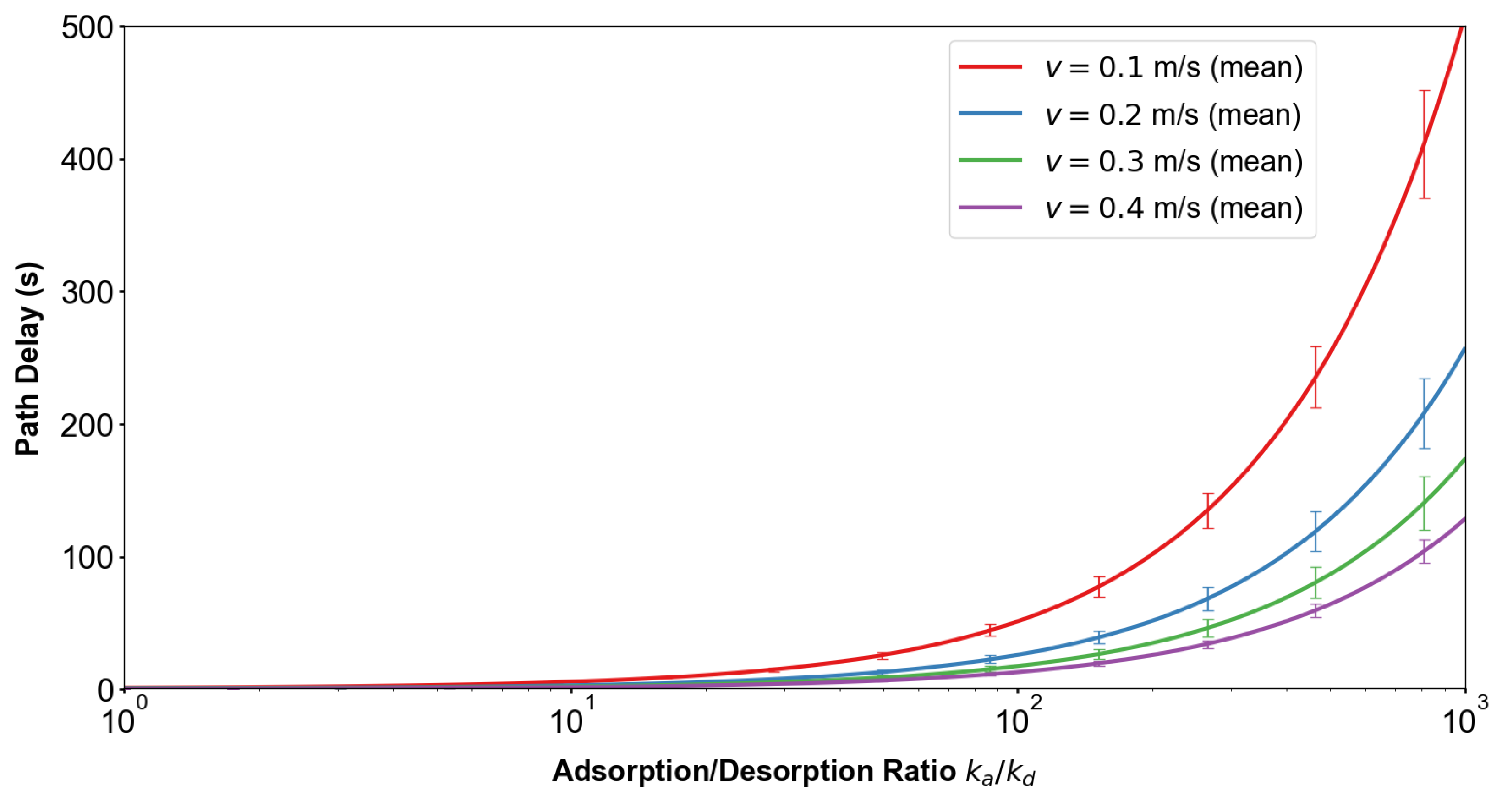 - (instantaneous desorption).In this regime the bound phase approaches the quasi-steady state , so the net exchange tends to zero. Physically, molecules attach but are immediately released, producing no effective retention. As a result, Equation (32) again reduces to