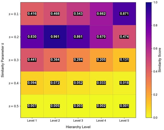 Based on the Gaussian likelihood similarity function defined in Equation (55), we evaluated the ability of the proposed framework to resolve small differences in stenosis severity under different noise conditions. For each vascular level , the five anchor severities were used as reference points (see Table 2). Pairs of hypotheses versus were compared, and the decision was made by maximum likelihood. Classification accuracy was estimated by Monte Carlo simulations with trials for each condition. Three severity gaps were examined under noise levels .