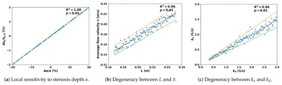 Figure 17 summarizes the local sensitivity and identifiability of the delay inversion framework. Panel (a) shows that peak time is highly sensitive to stenosis depth a, confirming that temporal delays directly encode lesion severity. Panel (b) reveals a degeneracy between vessel length L and average velocity , indicating that distinct geometric flow configurations can yield similar arrival times; this highlights a potential source of ambiguity that in practice may require auxiliary measurements to resolve. Panel (c) demonstrates that adsorption and desorption kinetics (, ) jointly shape delay responses, reflecting the dual role of endothelial binding and release in prolonging molecular retention. Across all panels, the regression fits yield with statistically significant correlations (), and the shaded envelopes confirm that parameter identifiability remains stable even under measurement noise. Together, these findings indicate that the proposed inversion approach can robustly recover key physiological parameters from noisy data, providing a reliable basis for quantitative assessment of vascular lesions in clinically relevant conditions.