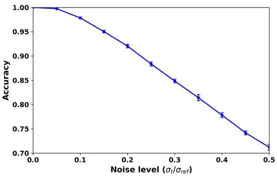 where was normalized with respect to the median nearest neighbor spacing in the reference delay library. For each noise level, random samples were generated and repeated times to obtain mean accuracies and standard deviations. Classification was then performed using the same nearest neighbor rule as in (55).