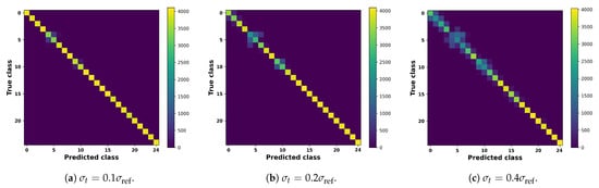 Figure 18 evaluates the robustness of the delay inversion framework under Gaussian noise. Classification accuracy remains above 95% when and still exceeds 80% at , indicating that the method tolerates moderate measurement uncertainty. This robustness is clinically relevant because physiological data are inevitably affected by pulsatility, sensor artifacts, and biological variability. Figure 19 further shows confusion matrices under different noise levels, where diagonal dominance is largely preserved, confirming that stenosis location and severity remain identifiable in most cases. Nonetheless, performance degrades when noise becomes excessive, especially in finer severity distinctions, underscoring that practical deployment will require careful calibration of sensing accuracy or multi-modal integration. Overall, these results support the diagnostic feasibility of the framework under realistic uncertainty while acknowledging its sensitivity to extreme noise conditions.
