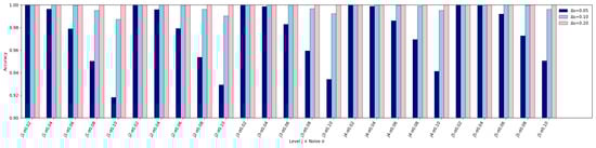 Resolution limit analysis of stenosis severity classification. Bars represent classification accuracy for three severity gaps , , and across all vascular levels and noise conditions. Larger severity differences () remain almost perfectly distinguishable under all tested noise levels, while moderate gaps () maintain accuracy above for most cases when s. In contrast, very small differences () are more sensitive to noise, with accuracy dropping below at s, particularly in proximal vessel levels. These findings confirm that the framework can robustly resolve stenosis severity differences down to under practical noise conditions.