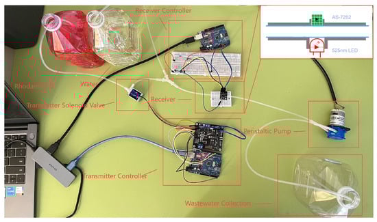 The platform employs Rhodamine B as the messenger molecule, injected into a micro-tube channel by a solenoid valve under a background flow generated by a peristaltic pump. At the receiver, a 525 nm LED excites the dye, and an AS-7262 spectral sensor captures the resulting fluorescence near 580 nm. In this way, changes in peak molecular concentration are converted into optical intensity signals, making it possible to observe peak response times that correspond to the inversion method introduced in this paper. The overall setup, including transmitter, channel, and receiver components, is shown in Figure 21.