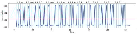 Measured Measured concentration waveform for the transmission of a 50-bit sequence. The blue line represents the concentration of messenger molecules received at the receiver end. The red line is a threshold line, whose value is related to the peaks of the first and second signals. If the concentration exceeds this value, the received signal is determined to be 1; otherwise, it is 0. Distinct peaks corresponding to individual bits are clearly observed, demonstrating that the spectral sensor can reliably detect symbol transitions. The temporal positions of the peaks directly encode the response times, confirming that stenosis-induced peak delays can be translated into measurable optical signals for practical MC experiments.