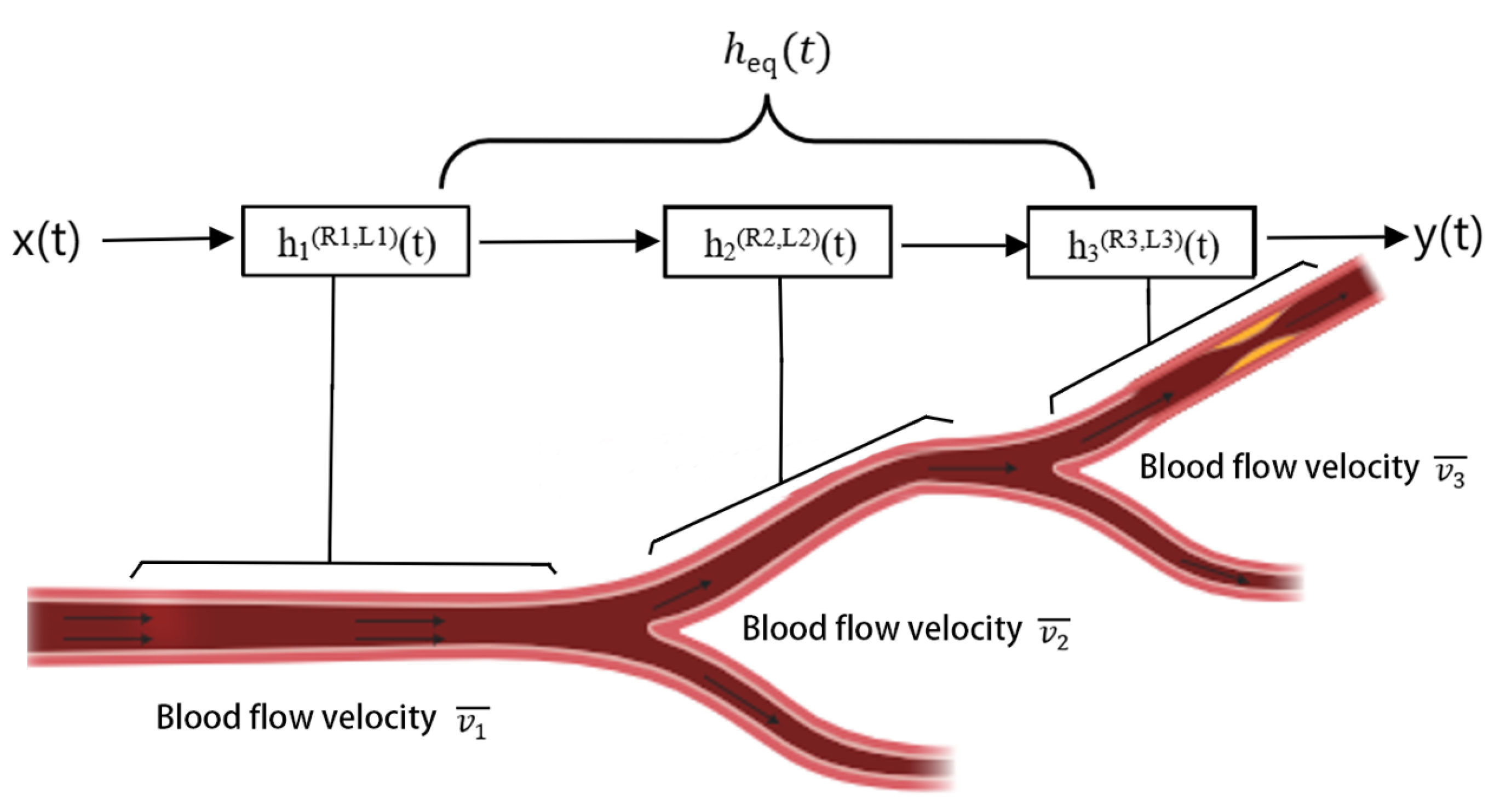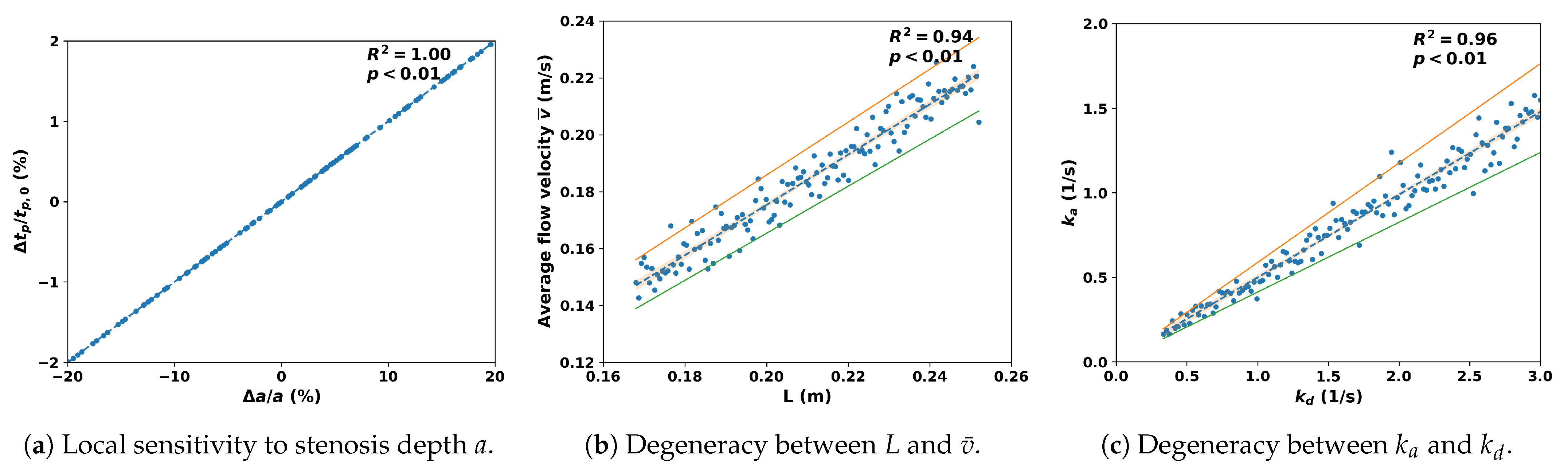 Peak response time (proposed) | Directly observable from maximum of ; used for stenosis localization in this study [43] | Peak amplitude may decrease under adsorption, but timing remains stable and robust. |
