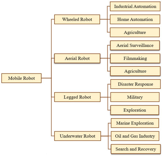 In this industrial era, Autonomous Mobile Robots (AMR) are replacing humans to perform efficient tasks, and also in other fields, such as industrial automation, smart homes, and autonomous driving, are crucial for enhancing production efficiency []. Various types of AMR, like wheeled robots for flat environments, legged robots mimic human locomotion by using legs, aerial robots are capable of flying, and underwater robots to perform their task in marines are available. The types of AMR and their applications are presented in Figure 1. AMR encompasses a broad range of applications, such as mining, military operations, rescue missions, space exploration, agriculture, medical [], and entertainment. In these areas, the successful navigation of AMR largely relies on its intelligence and capabilities [].