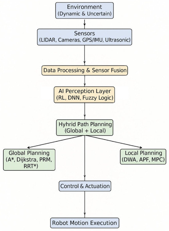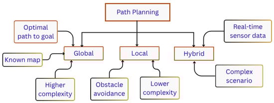 Path planning (PP) plays an important role in AMR for navigation. PP is to find the feasible path to attain the goal position, and it helps to avoid obstacles in the robot’s path []. It is possible with the help of software, regular sensors for vision and localization, and Artificial Intelligence (AI). Reinforcement Learning (RL) has a significant role in PP []. Hybrid PP algorithms integrate multiple planning strategies to enhance overall performance, enabling the identification of optimal paths and efficient goal attainment within minimal time. Hybrid PP approaches are typically designed to operate in both local and global environments, combining the strengths of each. Accordingly, PP algorithms can be broadly classified into three categories: global, local, and hybrid, as shown in Figure 2. Global PP is performed only in a known environment using graph-based technique. Local PP detects obstacles in its surroundings and navigates to its goal position. Hybrid PP algorithms are particularly effective in addressing complex scenarios, such as navigating narrow spaces or traversing diverse terrains. This paper primarily focuses on hybrid PP while also reviewing local, global, classical, heuristic, and hybrid PP techniques to provide a comprehensive understanding of the current landscape.