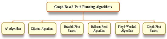 Graph-based PP algorithms use mathematical techniques to determine the shortest path from a start node to a goal node. This method operates using two types of maps: a grid map and a graph structure. It is suitable only for static environments with known obstacles. Figure 3 presents the various graph-based algorithms considered in this work.